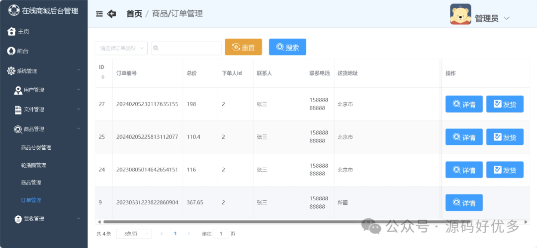 (3)订单管理模块:实现了订单的查询、创建、删除、退货等功能。