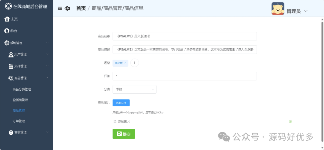 (1)商品管理模块:实现了商品的基本信息录入、图片上传、状态管理等相关功能。