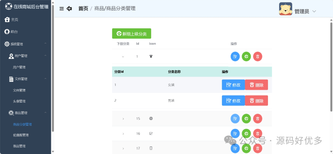 (2)商品分类模块:实现了分类的增删改查、分类层级管理、商品分类的关联等功能。