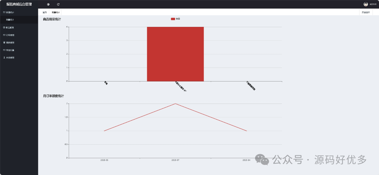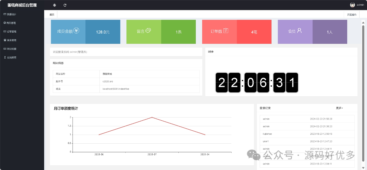 2. 首页,数据看板,订单统计、网站基本信息、登录日志等概览数据。