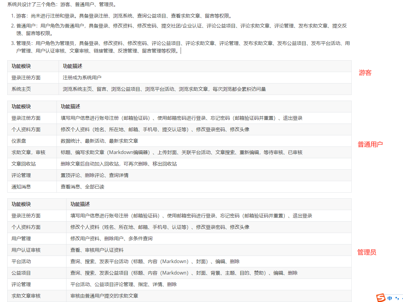 - 普通用户后台:| 仪表盘 | 数据统计、最新活动、最新求助文章 | | ---------- | ------------------------------------------------------------ | | 求助文章 | 标题、编写求助文章(Markdown编辑器)、上传封面、关联平台活动、文章搜索、重新编辑 | | 审核队列 | 等待审核、已审核 | | 文章回收站 | 删除文章后自动加入回收站,可再次删除、移出回收站 | | 评论管理 | 置顶评论、删除评论、查询详情 | | 通知消息 | 查看消息、全部已读 |