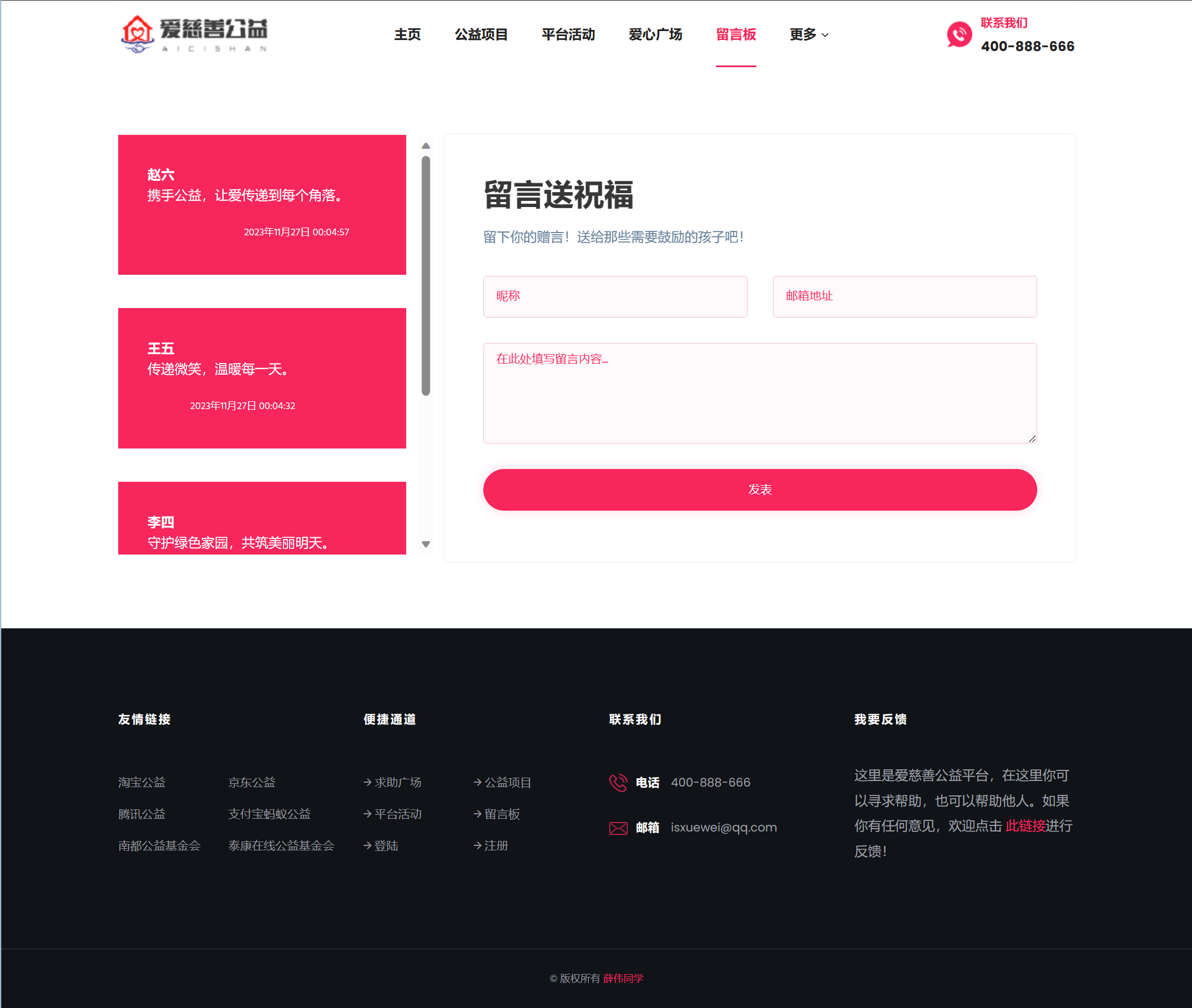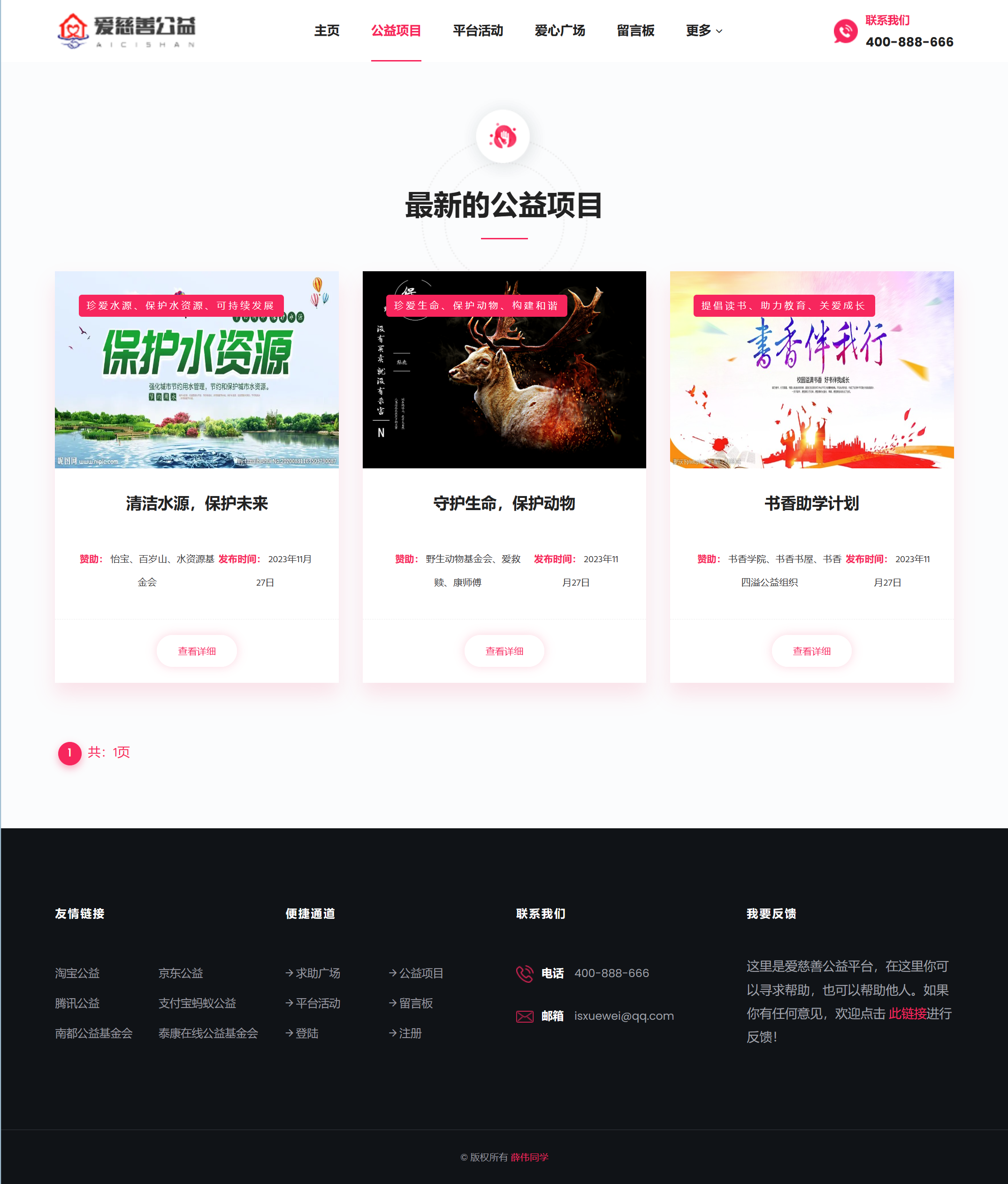 - 公益项目:包括项目标题、内容(Markdown)、封面、背景、主题、目的、赞助