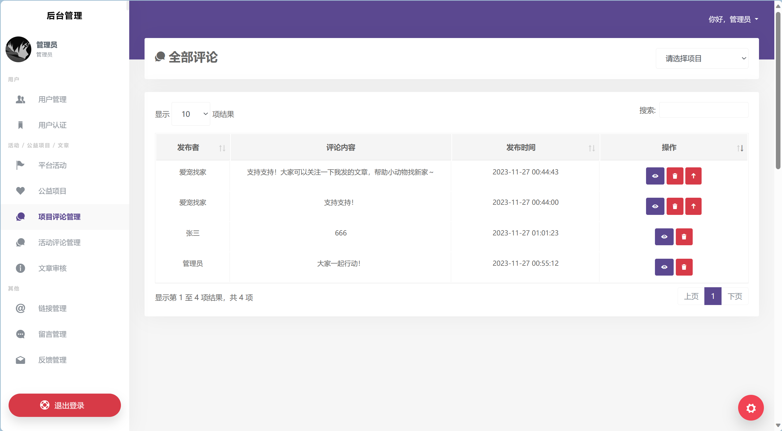 - 普通用户后台:| 仪表盘 | 数据统计、最新活动、最新求助文章 | | ---------- | ------------------------------------------------------------ | | 求助文章 | 标题、编写求助文章(Markdown编辑器)、上传封面、关联平台活动、文章搜索、重新编辑 | | 审核队列 | 等待审核、已审核 | | 文章回收站 | 删除文章后自动加入回收站,可再次删除、移出回收站 | | 评论管理 | 置顶评论、删除评论、查询详情 | | 通知消息 | 查看消息、全部已读 |