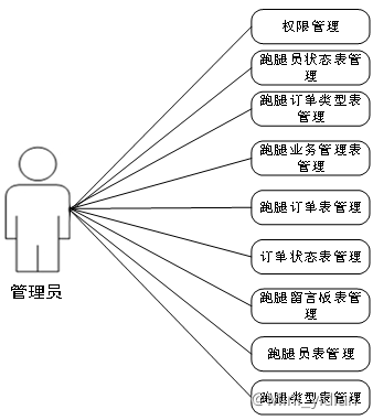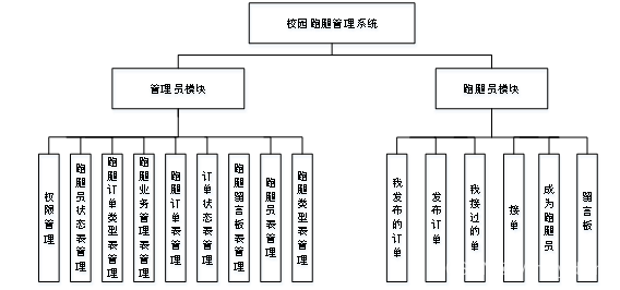 系统整体模块设计:系统分为管理员和跑腿员两大角色,系统管理员有最大的权限,总体功能展示如图所示。