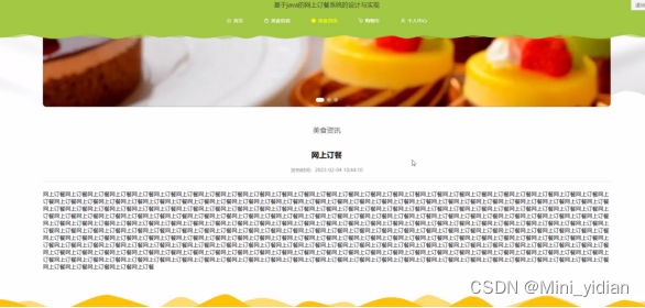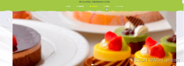 当用户打开系统的网址后,首先看到的就是首页界面。在这里,用户能够看到网上订餐系统的导航条显示首页、美食信息、美食资讯、购物车、个人中心等。系统首页界面如图所示:
