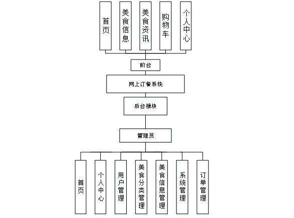网上订餐系统按照权限的类型进行划分,分为用户和管理员两个模块。用户模块主要实现个人信息修改、对美食信息、美食资讯、购物车等信息进行操作,增强了用户的操作体验。管理员模块主要针对整个系统的管理进行设计,提高了管理的效率和标准。系统的总体模块设计如下图所示: