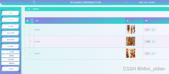 管理员进入主页面,主要包括对首页、个人中心、用户管理、美食分类管理、美食信息管理、系统管理、订单管理等进行操作。管理员主页面如图所示: