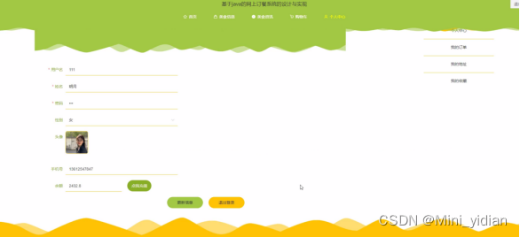 在个人中心页面可以更新个人详细信息,还可以对我的订单,我的地址和我的收藏进行详细操作;如图所示: