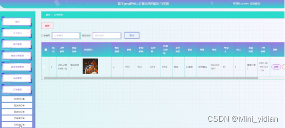 管理员点击订单管理,在订单管理页面的搜索栏输入订单编号、商品名称、商品图片、购买数量、价格、折扣价格、总价格、折扣总价格、支付类型、状态、地址、电话、收货人、备注、商品类型、下单时间,然后进行查询或删除订单信息等操作。如图所示:
