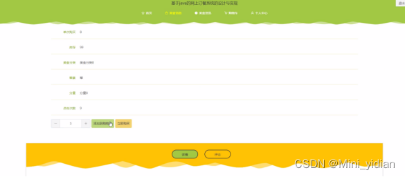 在美食信息页面的搜索栏输入菜品名称、美食分类、价格,进行查询,然后可以查看菜品名称、美食分类、封面、荤素、分量、单限、库存、价格、点击次数等信息,并且可以进行添加到购物车、立即购买、评论或收藏等操作,页面如图所示:
