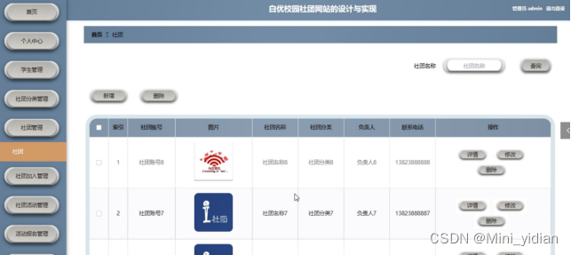 管理员点击社团管理;在社团管理页面输入社团账号、图片、社团名称、社团分类、负责人、联系电话等信息,进行查询,新增或删除社团信息等操作;如图所示。