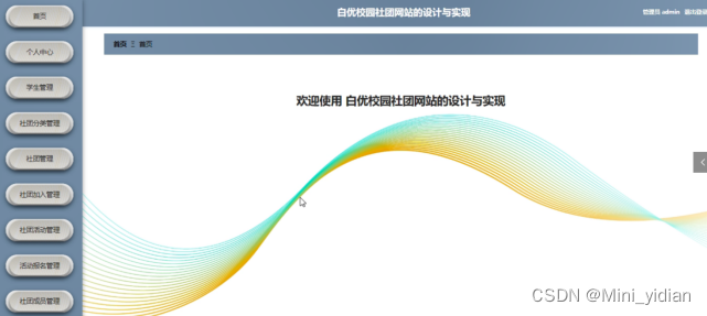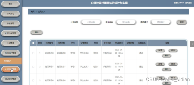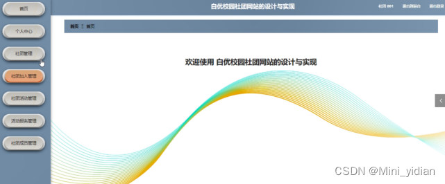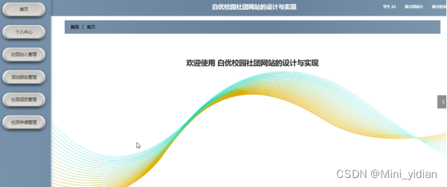 学生登录到白优校园社团网站可以查看首页、个人中心、社团加入管理、活动报名管理、社团成员管理、社团申请管理等信息,进行相应操作,如图所示。