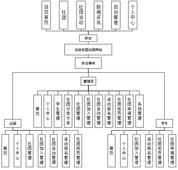 该章节的功能模块设计,只是大概描述了系统的所有功能模块,将功能按权限来讲解。系统总体结构图如图所示。