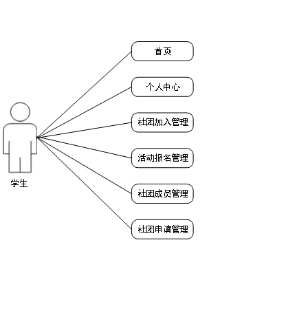 主要使用者为学生。具备有:首页、个人中心、社团加入管理、活动报名管理、社团成员管理、社团申请管理功能。学生用例图如图所示。