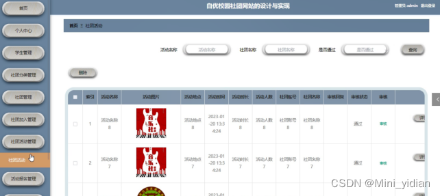 管理员点击社团活动管理;在社团活动管理页面对活动名称、活动图片、活动地点、活动时间、活动时长、活动人数、社团账号、社团名称、审核回复、审核状态、审核等信息,进行查询或删除社团活动等操作;如图所示。