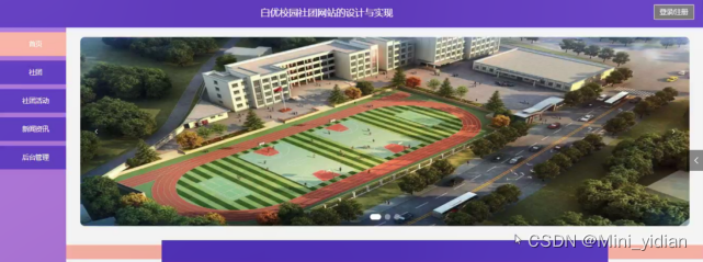 当游客打开系统的网址后,首先看到的就是首页界面。在这里,游客能够看到白优校园社团网站的导航条显示首页、社团、社团活动、新闻资讯、后台管理。系统首页界面如图所示: