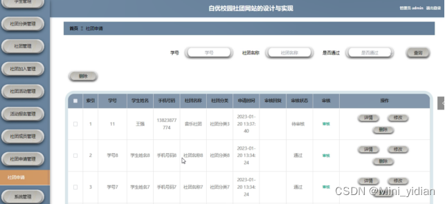 管理员点击社团申请管理;在社团申请管理页面对学号、学生姓名、手机号码、社团名称、社团分类、申请时间、审核回复、审核状态、审核等信息,进行查询或删除社团申请等操作;如图所示。