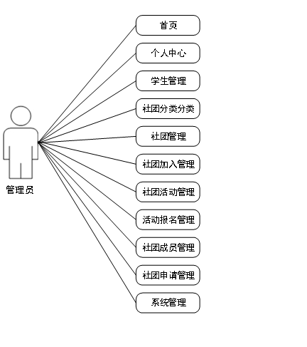 进行维护,以及平台的后台管理工作都依靠管理员,其可以对信息进行管理。需具备功能有;首页、个人中心、学生管理、社团分类分类、社团管理、社团加入管理、社团活动管理、活动报名管理、社团成员管理、社团申请管理、系统管理。管理员用例图如图所示。