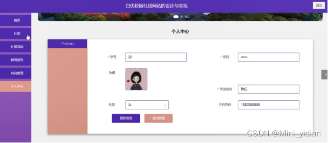 在个人中心页面可以输入学号、密码、头像、学生姓名、性别、手机号码等信息,进行信息更新,如图所示: