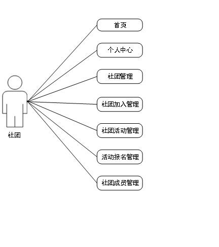使用者包括社团,具备有:首页、个人中心、社团管理、社团加入管理、社团活动管理、活动报名管理、社团成员管理功能。社团用例图如图所示。