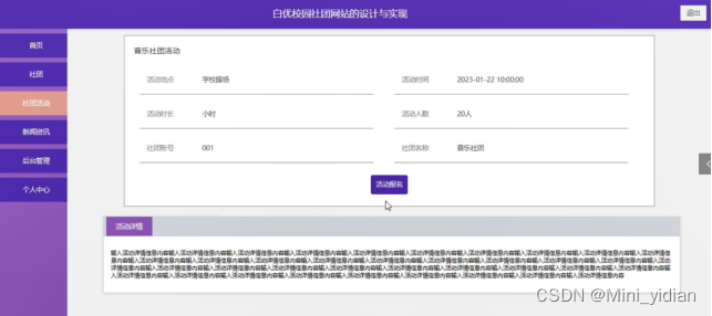 学生点击社团活动,在社团活动页面的搜索栏输入活动名称等信息,进行查询,还可以查看活动名称、活动图片、活动地点、活动时间、活动时长、活动人数、社团账号、社团名称,还可以点击活动报名等操作;如图所示: