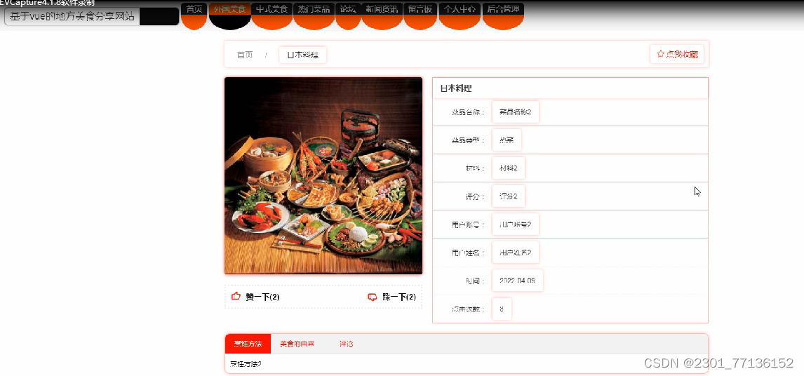 外国美食,在外国美食页面可以查看菜品名称,菜品类型,材料,评分,用户账号,用户姓名,时间,点击次数等内容,可以根据需要进行赞一下,踩一下,点我收藏等操作,如图所示。