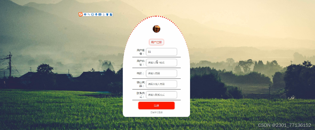 用户注册,在用户注册页面通过填写用户账号,姓名,密码,确认密码,联系方式等信息进行注册操作,如图所示。