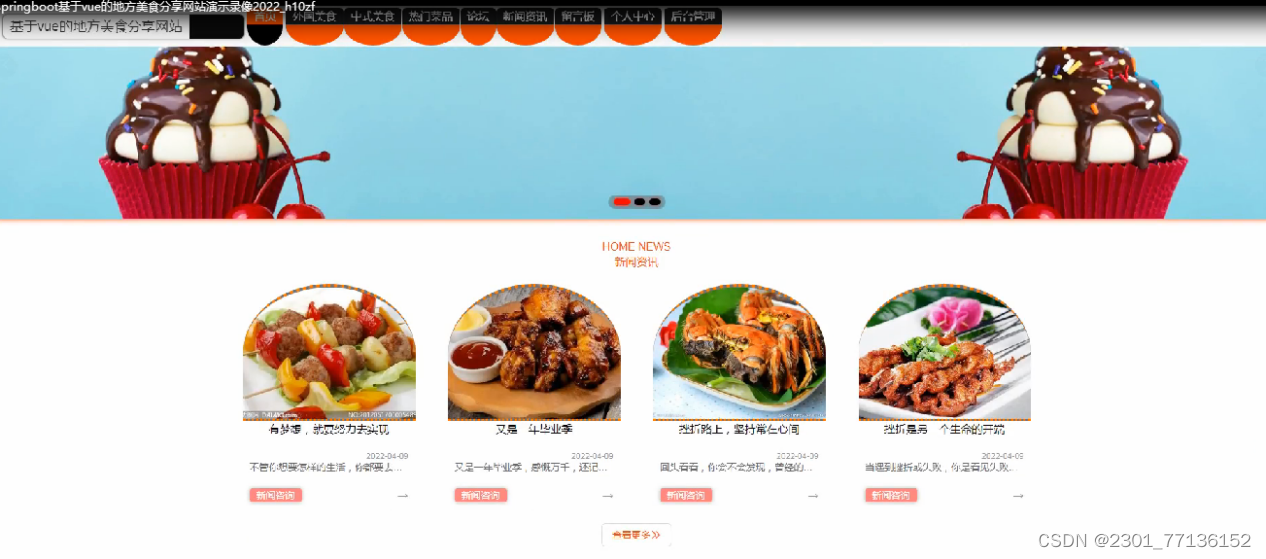 地方美食分享网站,在网站首页可以查看首页,外国美食,中式美食,热门菜品,论坛,新闻资讯,留言板,个人中心,后台管理等内容,并进行详细操作,如图所示。