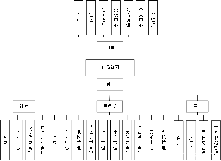 通过市场调研及咨询研究,了解了使用者及管理者的使用需求,于是制定了管理员,社团和用户等模块。其功能结构图如下图所示:
