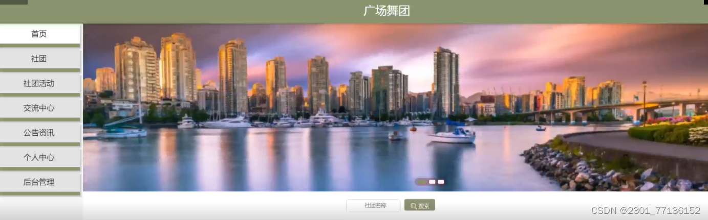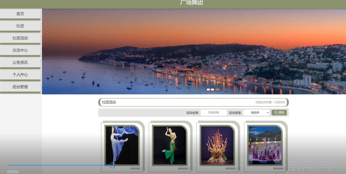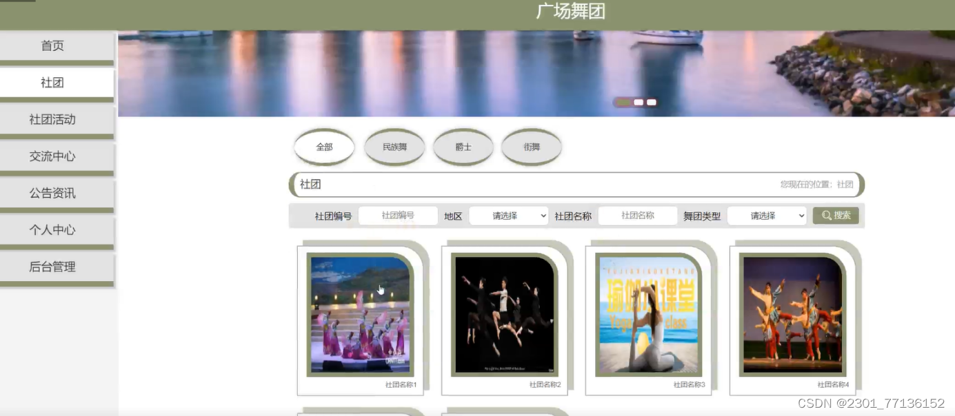 广场舞团,在系统首页可以查看首页,社团,社团活动,交流中心,公告资讯,个人中心,后台管理等功能并进行详细操作,如图所示。