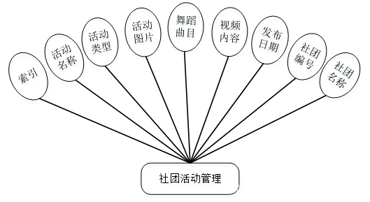 社团活动管理;在社团活动管理页面中可以对索引、活动名称、活动流程、活动图片、舞蹈曲目、视频内容、发布日期、社团编号、社团名称等内容进行查看,修改和删除操作。