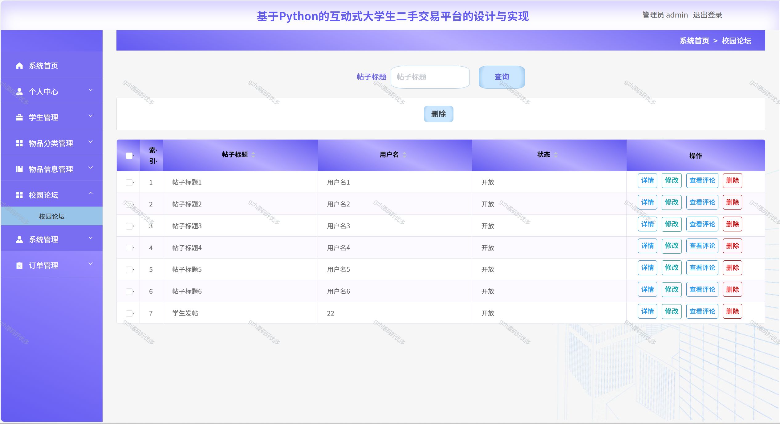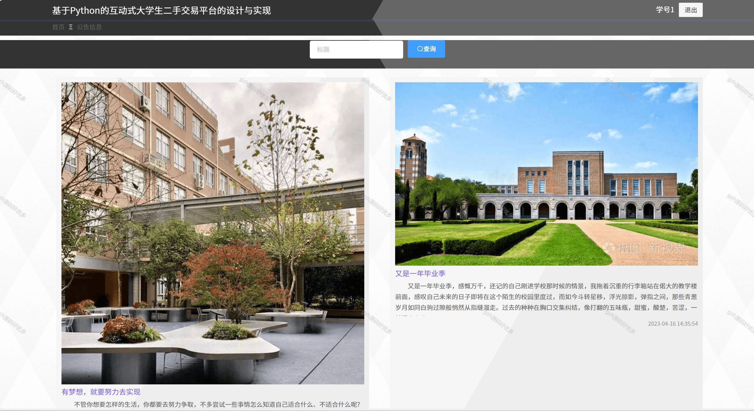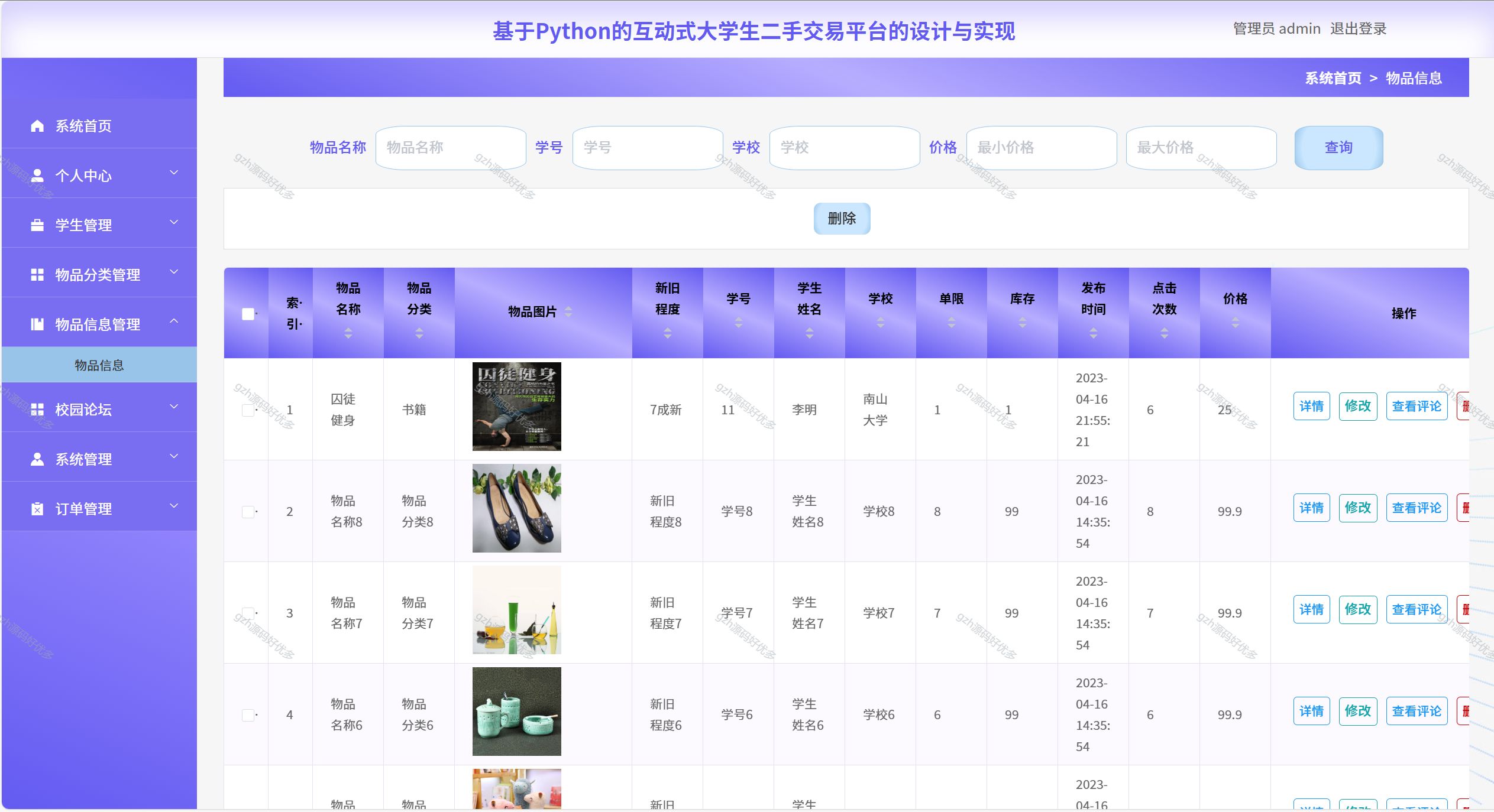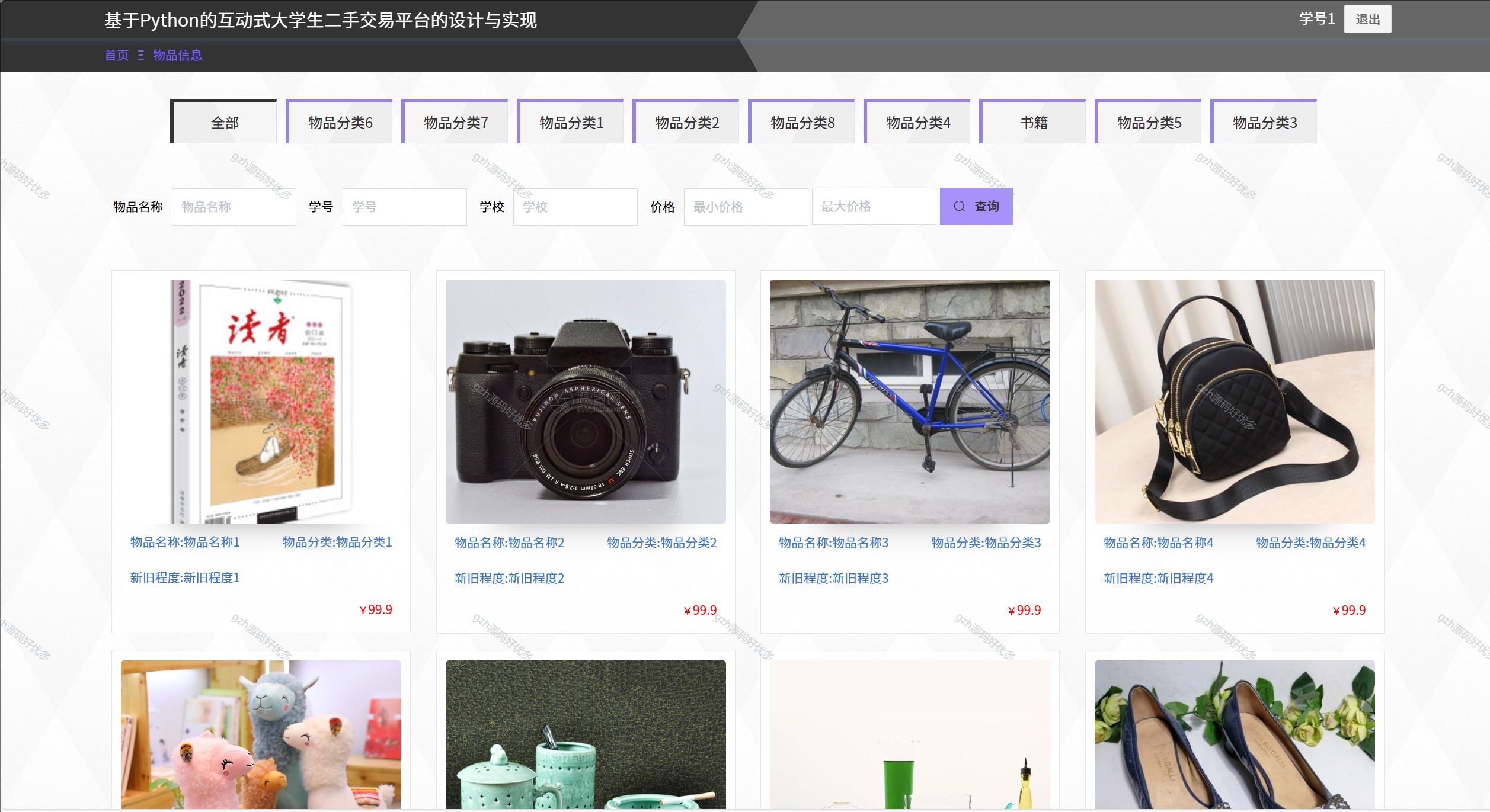 项目编号:python069为满足大学生群体对闲置物品流转的需求,并顺应数字化发展趋势,我们开发了这款互动式校园二手交易平台。该平台深度融合电子信息技术,旨在为高校学生提供一个便捷、高效的物品交易环境。系统设计遵循模块化原则,主要包含管理员与学生两大功能模块,并设定了差异化的用户准入机制。各模块设计清晰,便于未来的功能扩展与系统维护。在架构上,我们采用了组件化、逻辑与数据分离等现代软件开发方法,确保了系统的可维护性和扩展性。