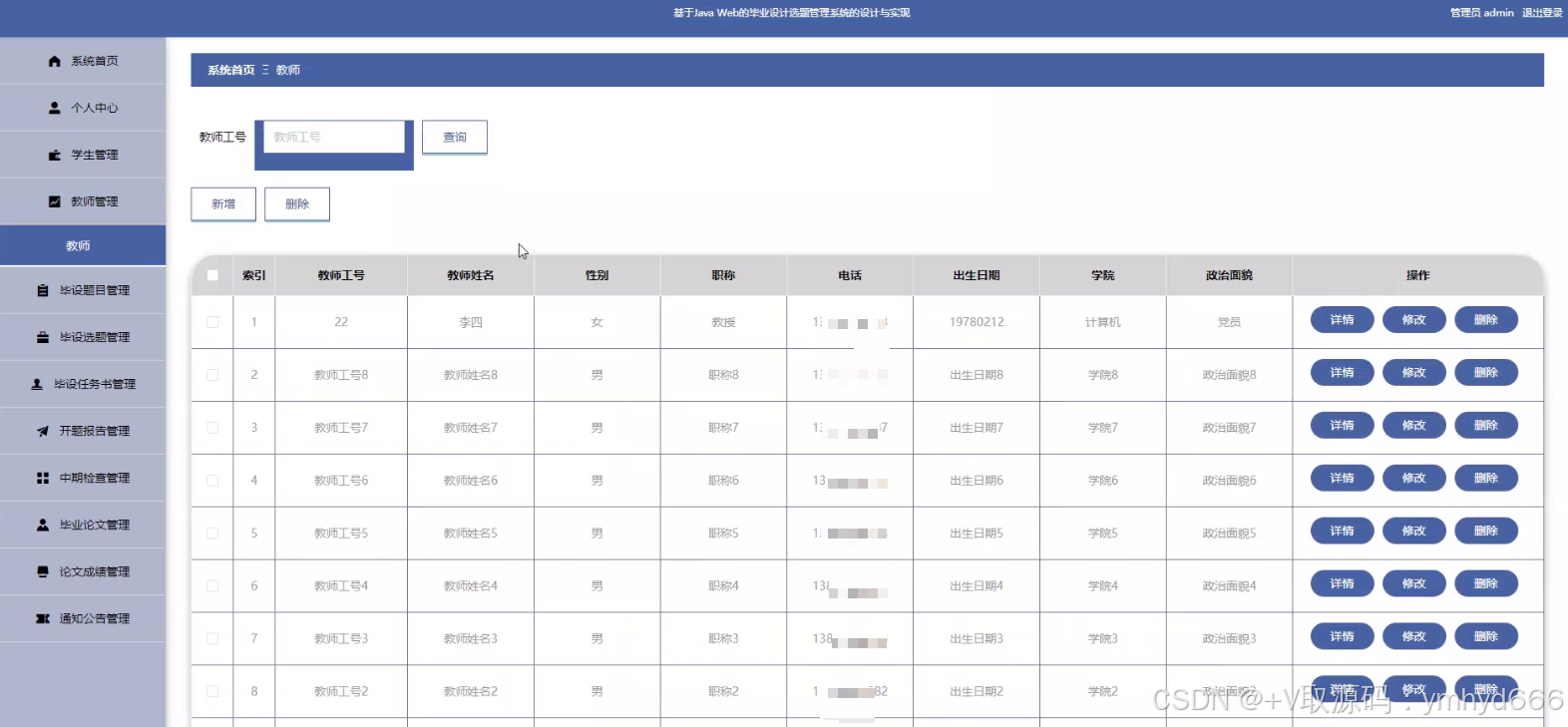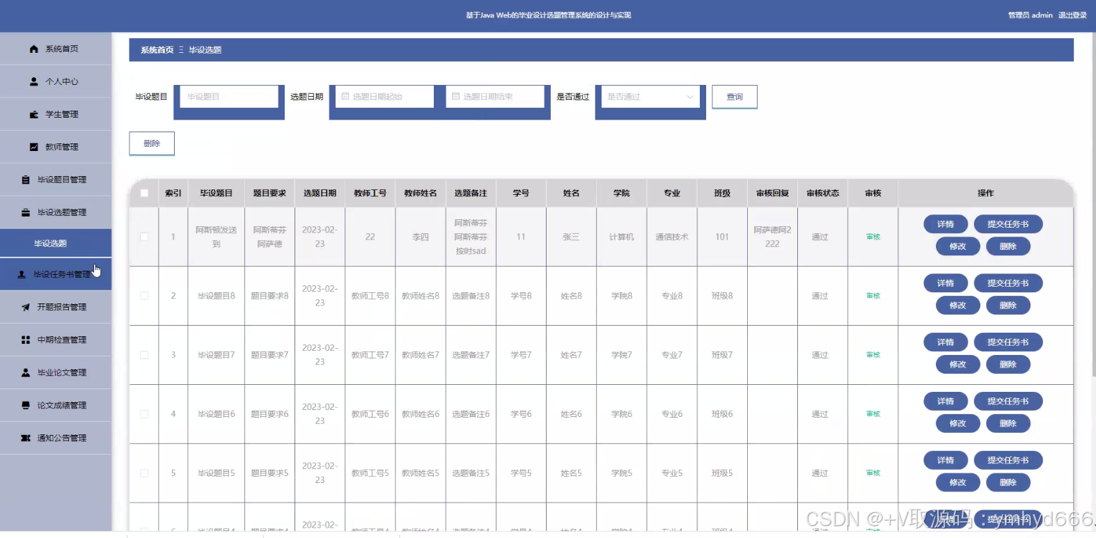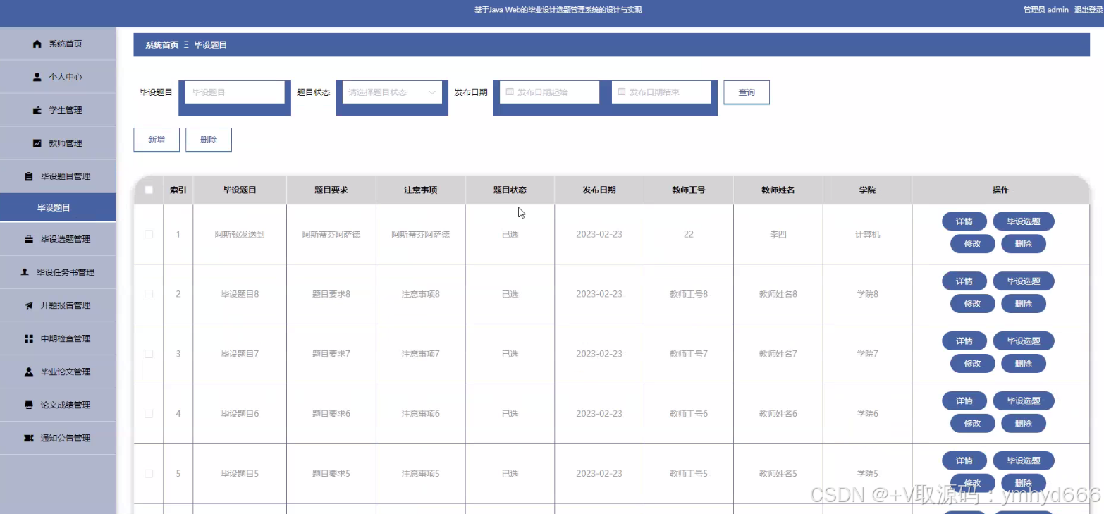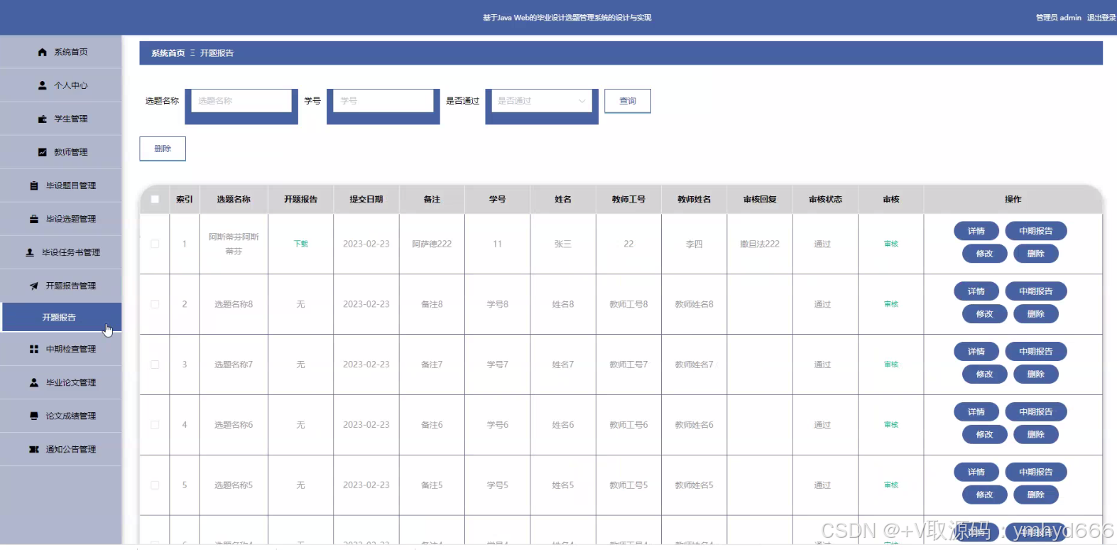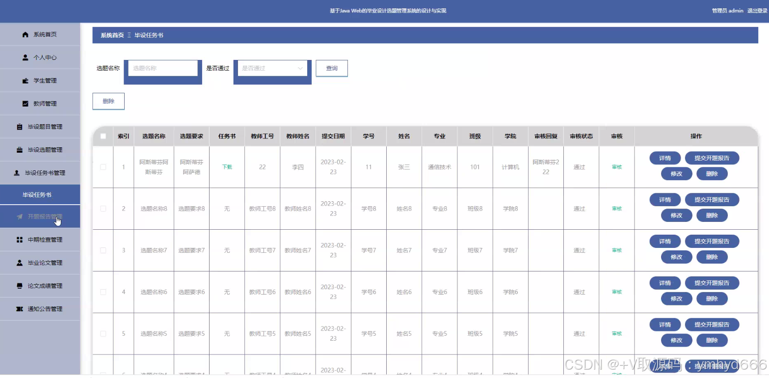 管理员的功能:系统首页、个人中心、学生管理、教师管理、毕设题目管理、毕设选题管理、毕设任务书管理、开题报告管理、中期检查管理、毕业论文管理、论文成绩管理、通知公告管理。