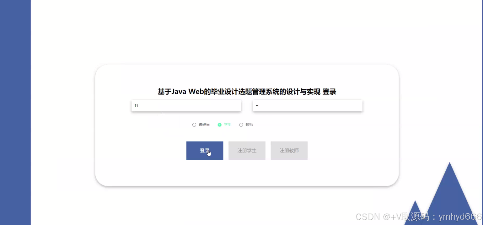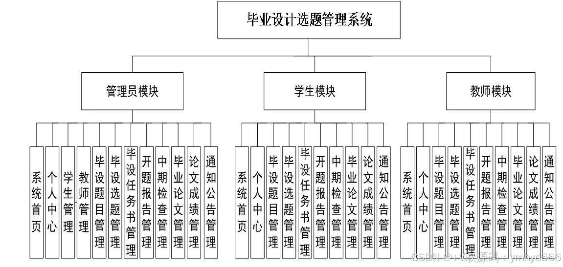 学生的功能:系统首页、个人中心、毕设题目管理、毕设选题管理、毕设任务书管理、开题报告管理、中期检查管理、毕业论文管理、论文成绩管理、通知公告管理。