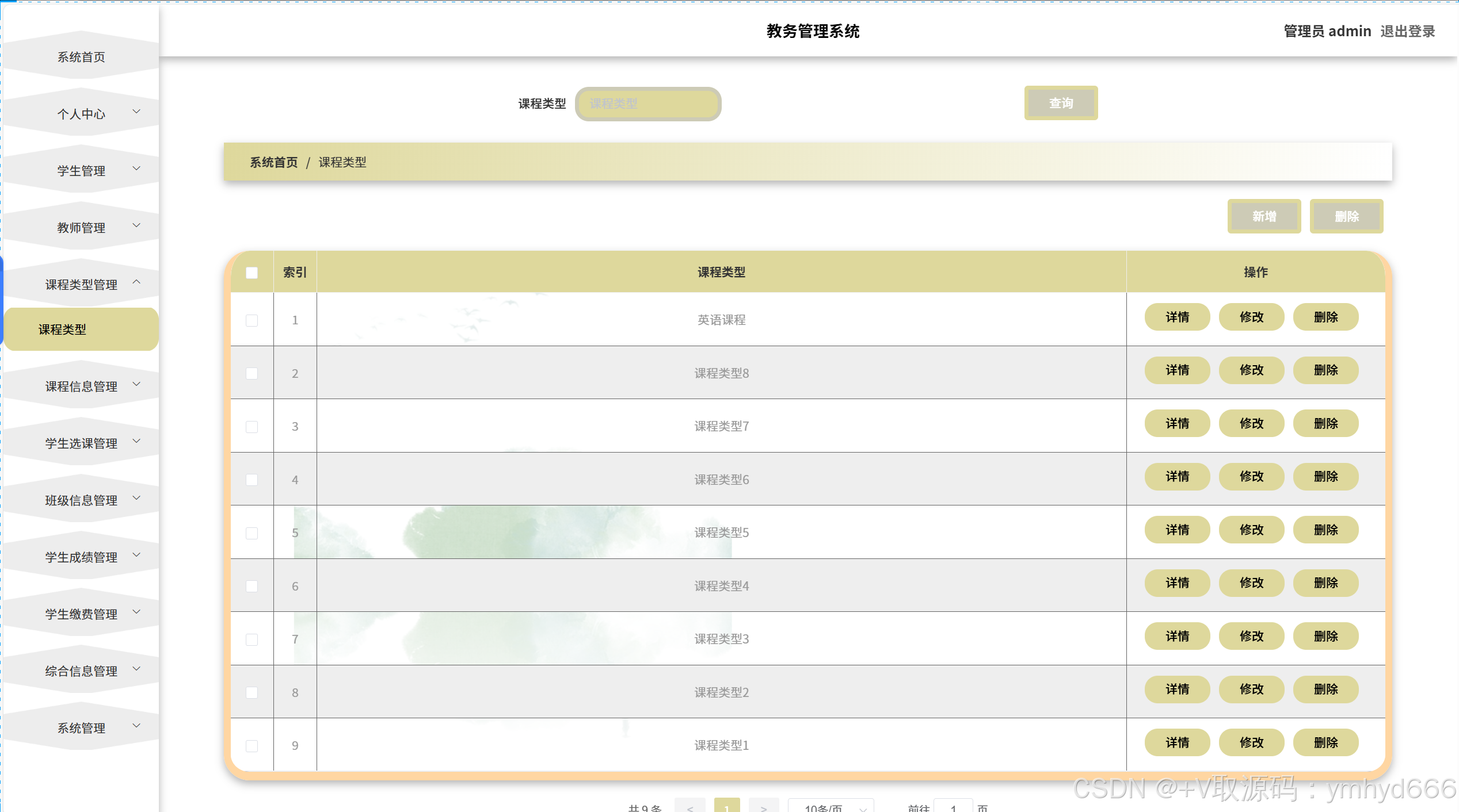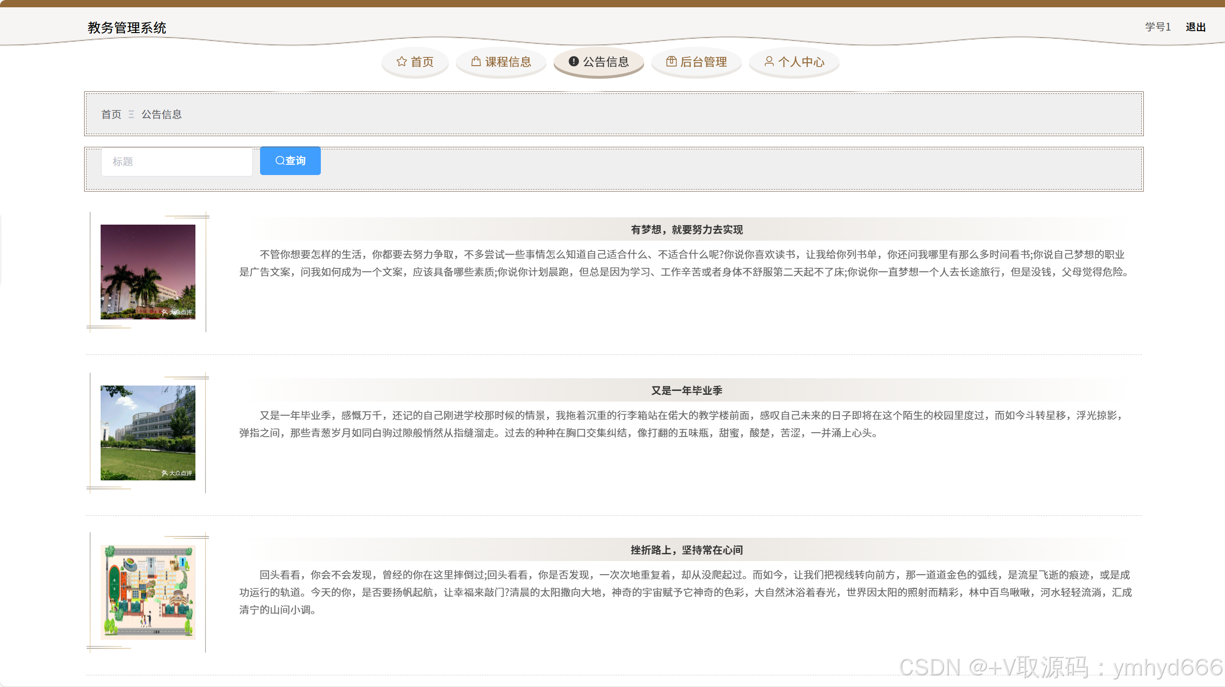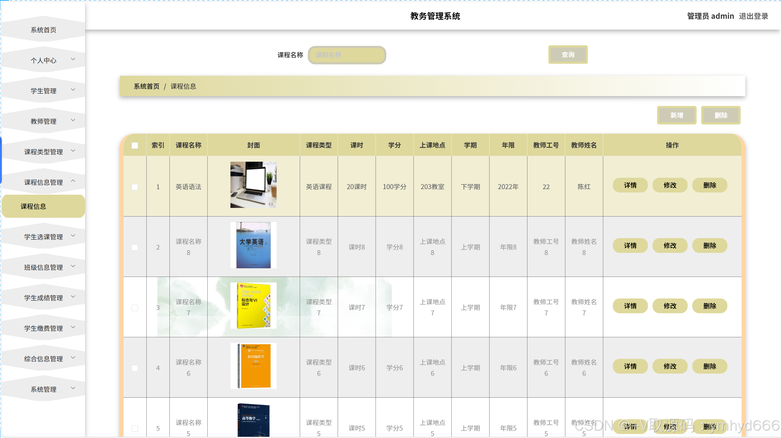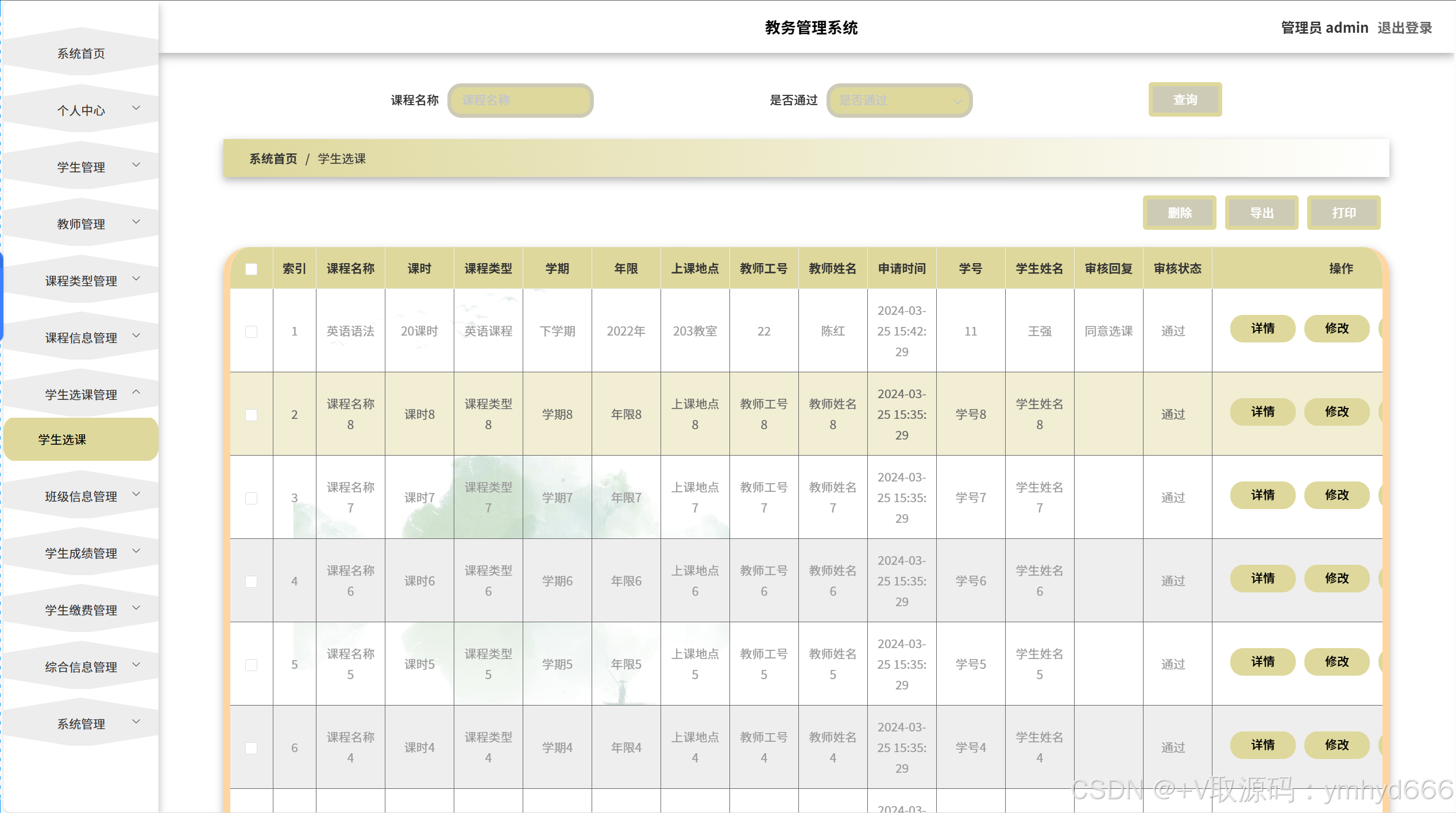 本项目(编号:springbootA409)为基于SpringBoot的教学管理系统,包含管理员、学生与教师三类用户角色。系统提供课程管理、学生选课、成绩录入、班级管理、缴费查询等核心功能,通过简洁的界面设计与完善的后台管理,满足现代化教务管理需求,提升教学管理效率。
