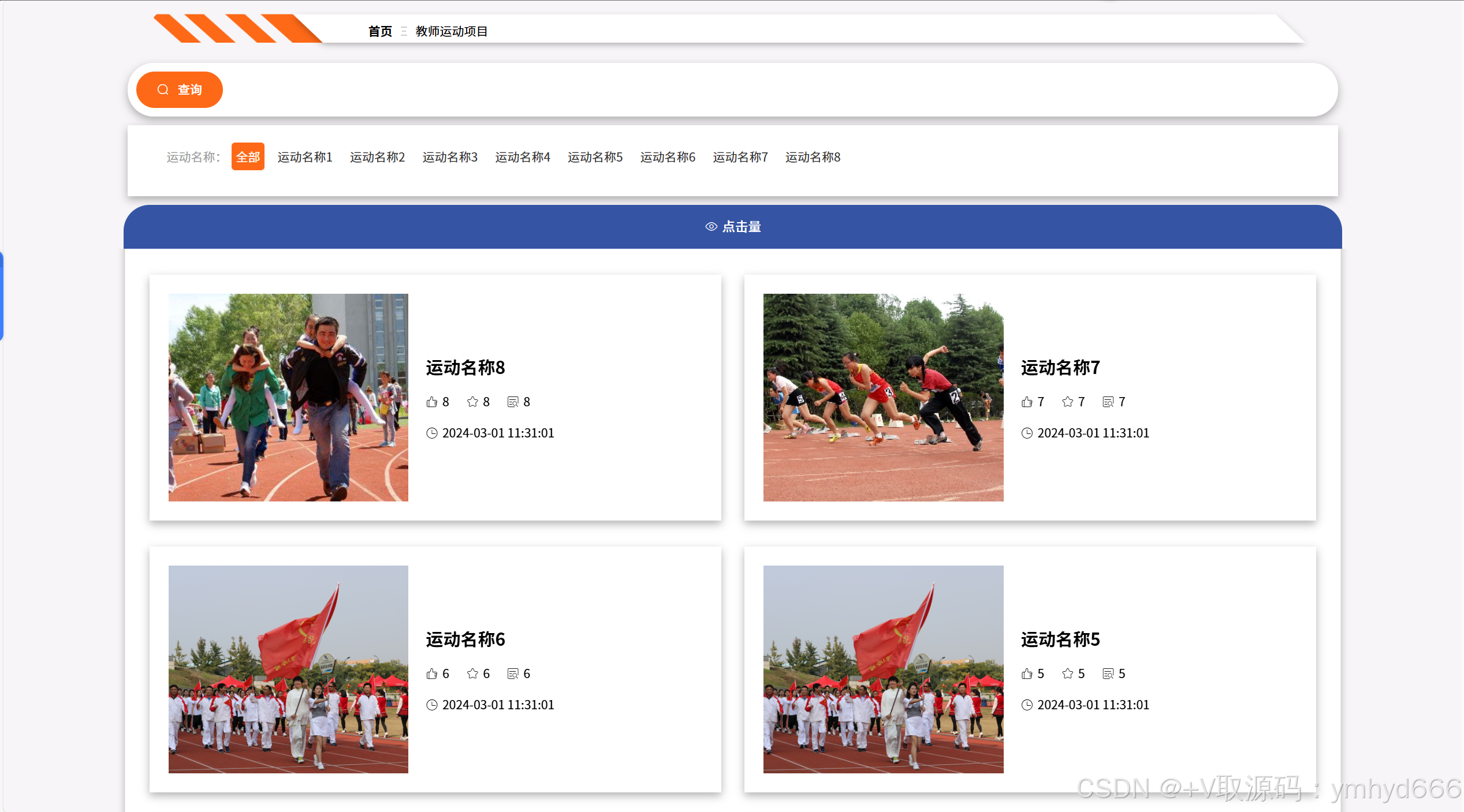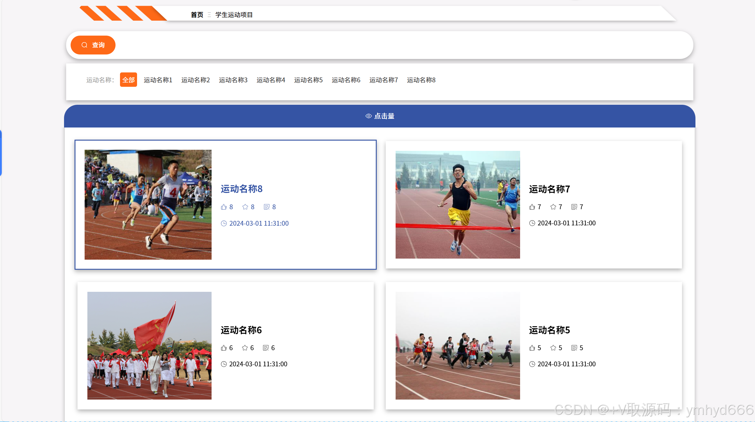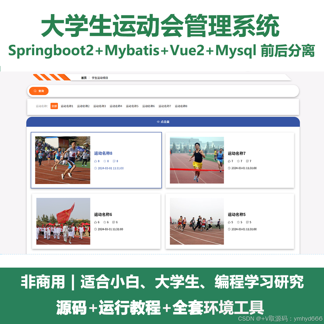 本项目(编号:springbootA407)为基于SpringBoot的高校运动会管理系统,整合赛事报名、赛程安排、成绩录入与信息发布等核心功能。系统分为学生/教师前端与管理员后台,支持在线报名、赛程查看、成绩统计及人员管理,实现运动会全流程信息化管理与高效组织。