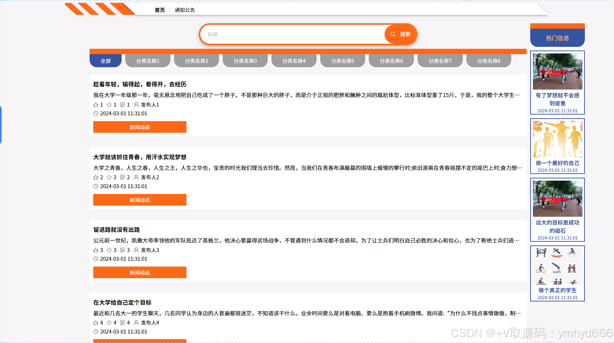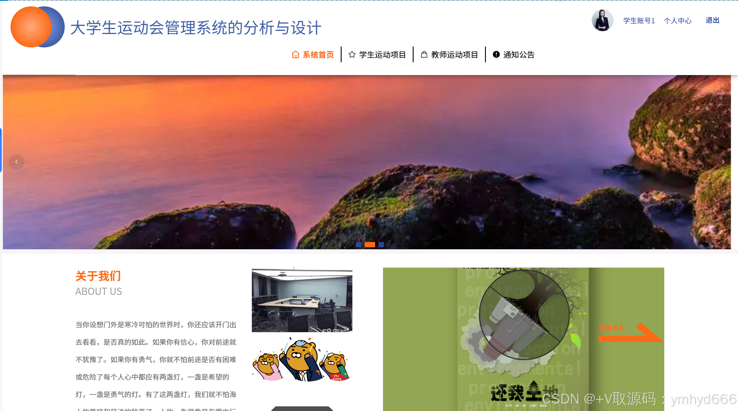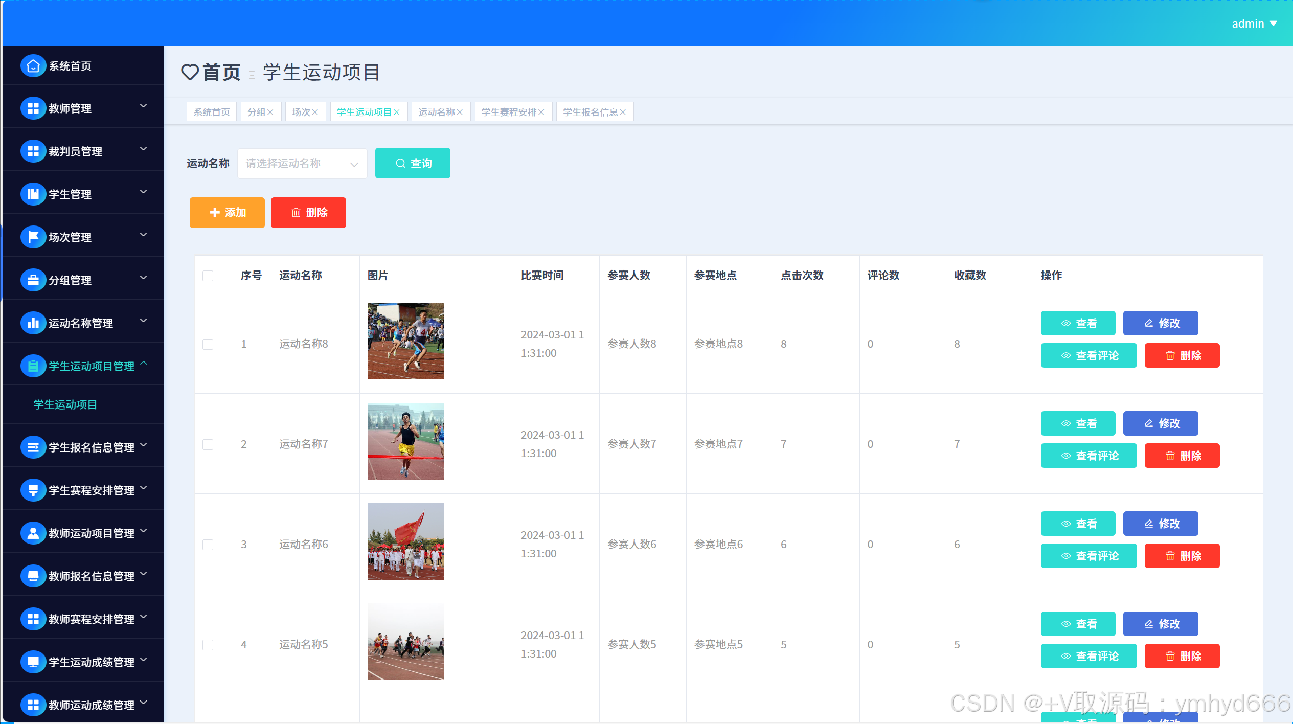 本项目(编号:springbootA407)为基于SpringBoot的高校运动会管理系统,整合赛事报名、赛程安排、成绩录入与信息发布等核心功能。系统分为学生/教师前端与管理员后台,支持在线报名、赛程查看、成绩统计及人员管理,实现运动会全流程信息化管理与高效组织。