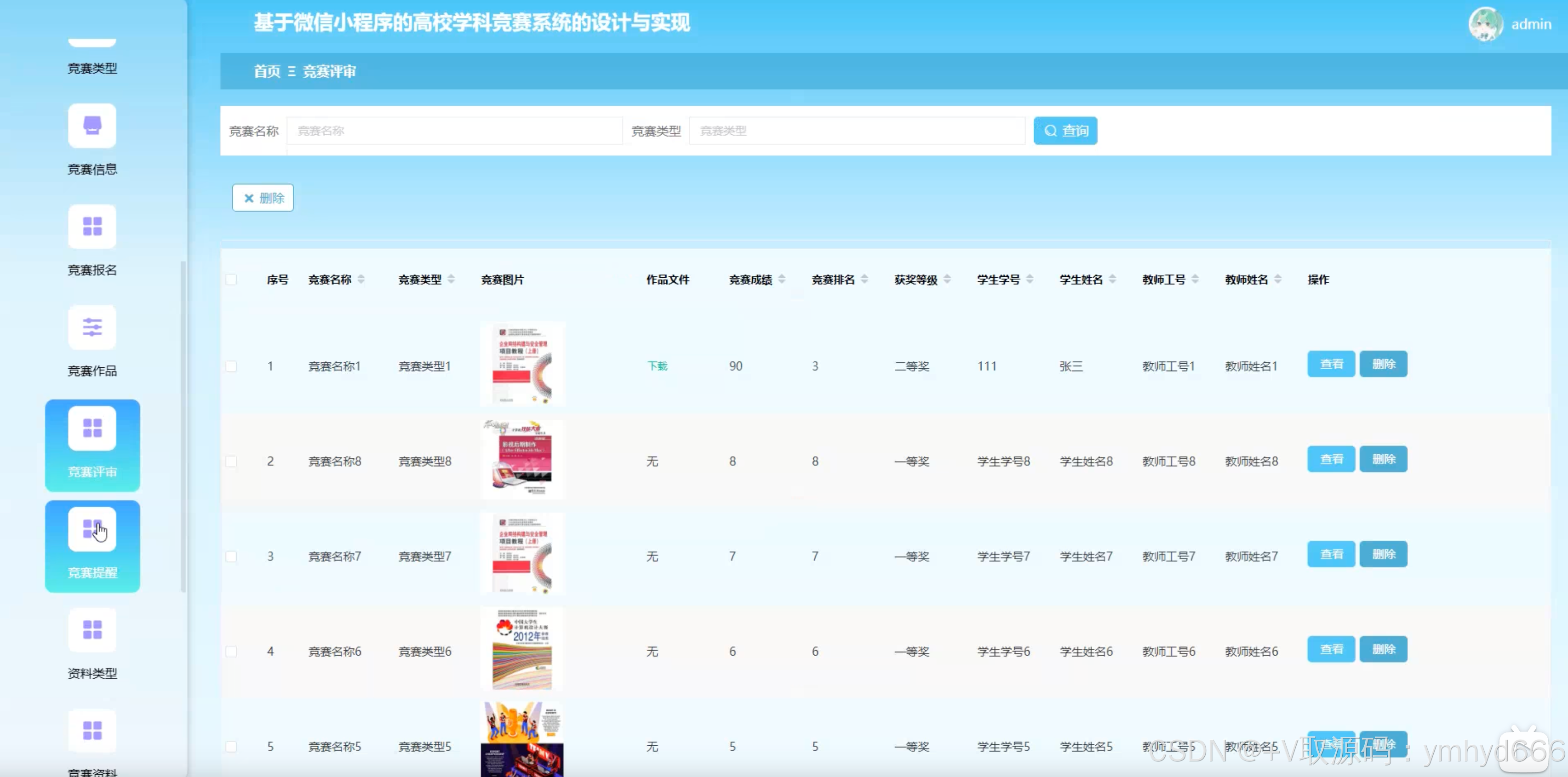 管理员功能:登录、学生管理、教师管理、竞赛信息管理、竞赛类型管理、竞赛题型管理、竞赛报名管理、竞赛作品管理、竞赛评审管理、竞赛资料管理、资料类型管理。