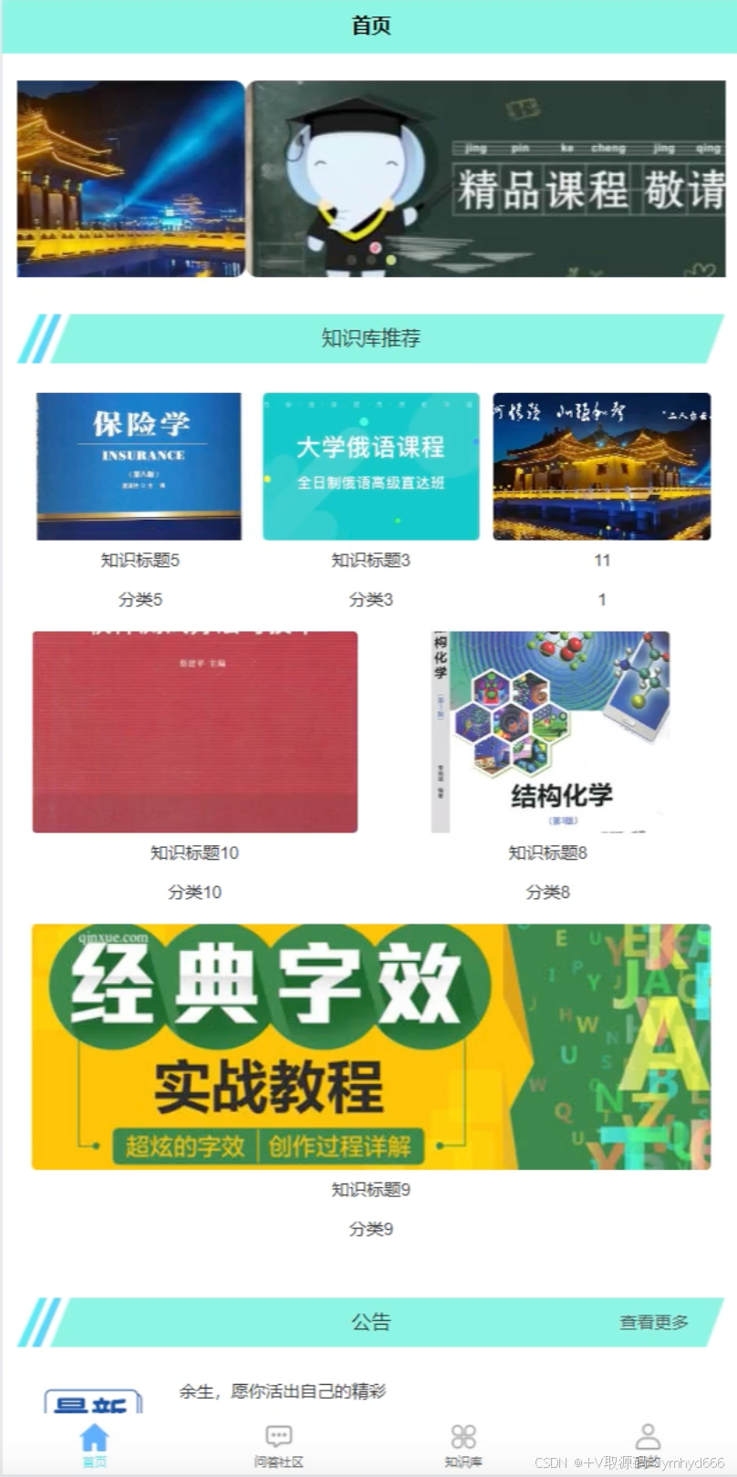 用户功能:注册登录、知识浏览、问答交流、分类查询、评论互动、个人中心。