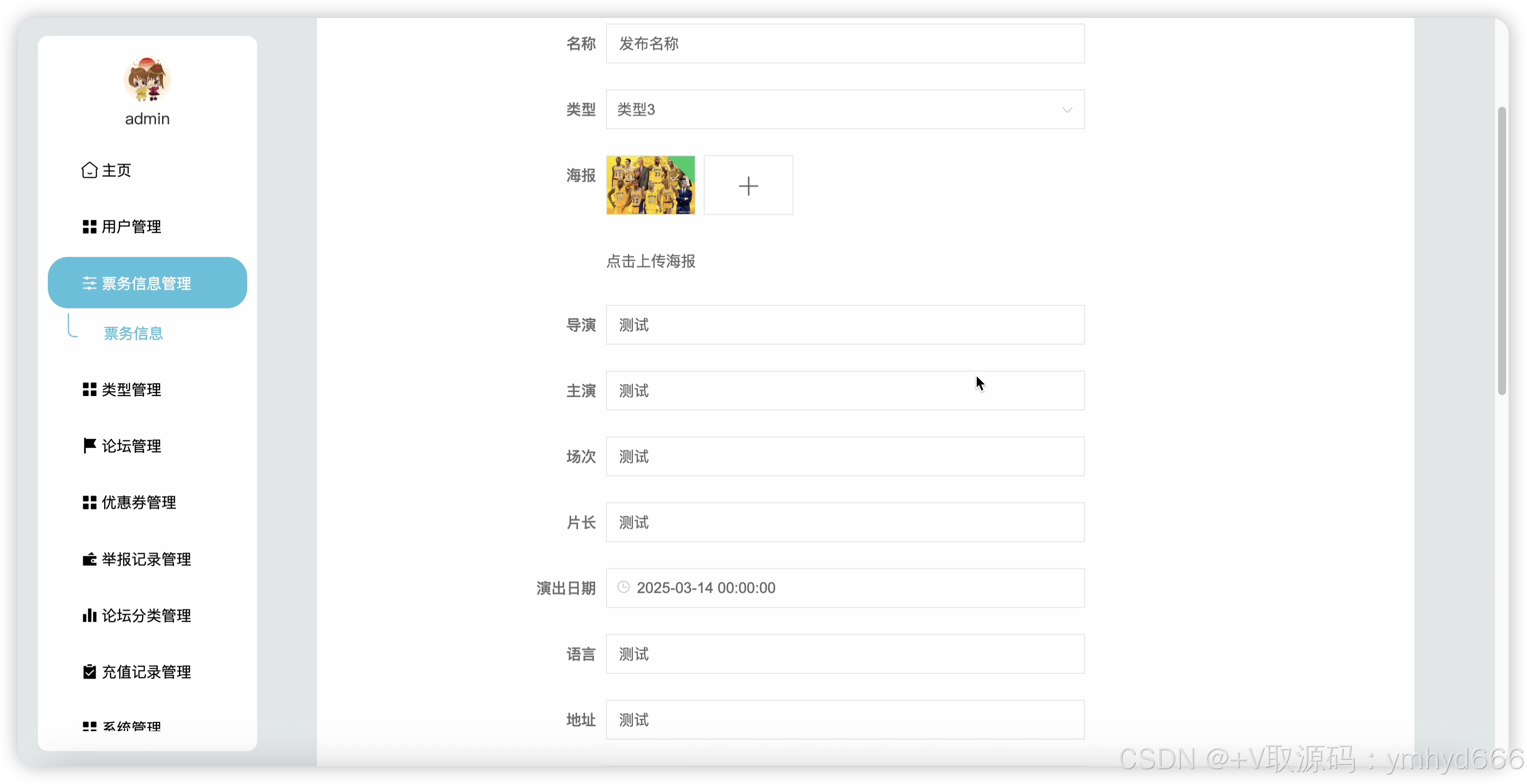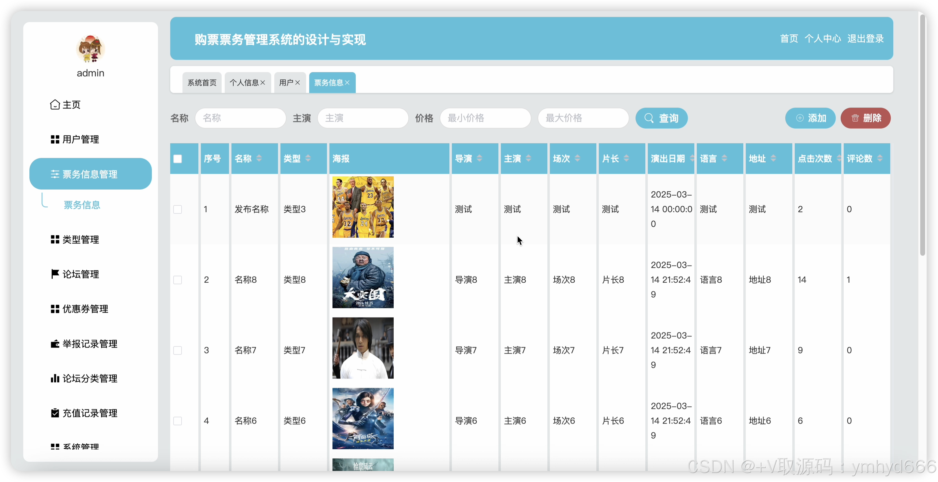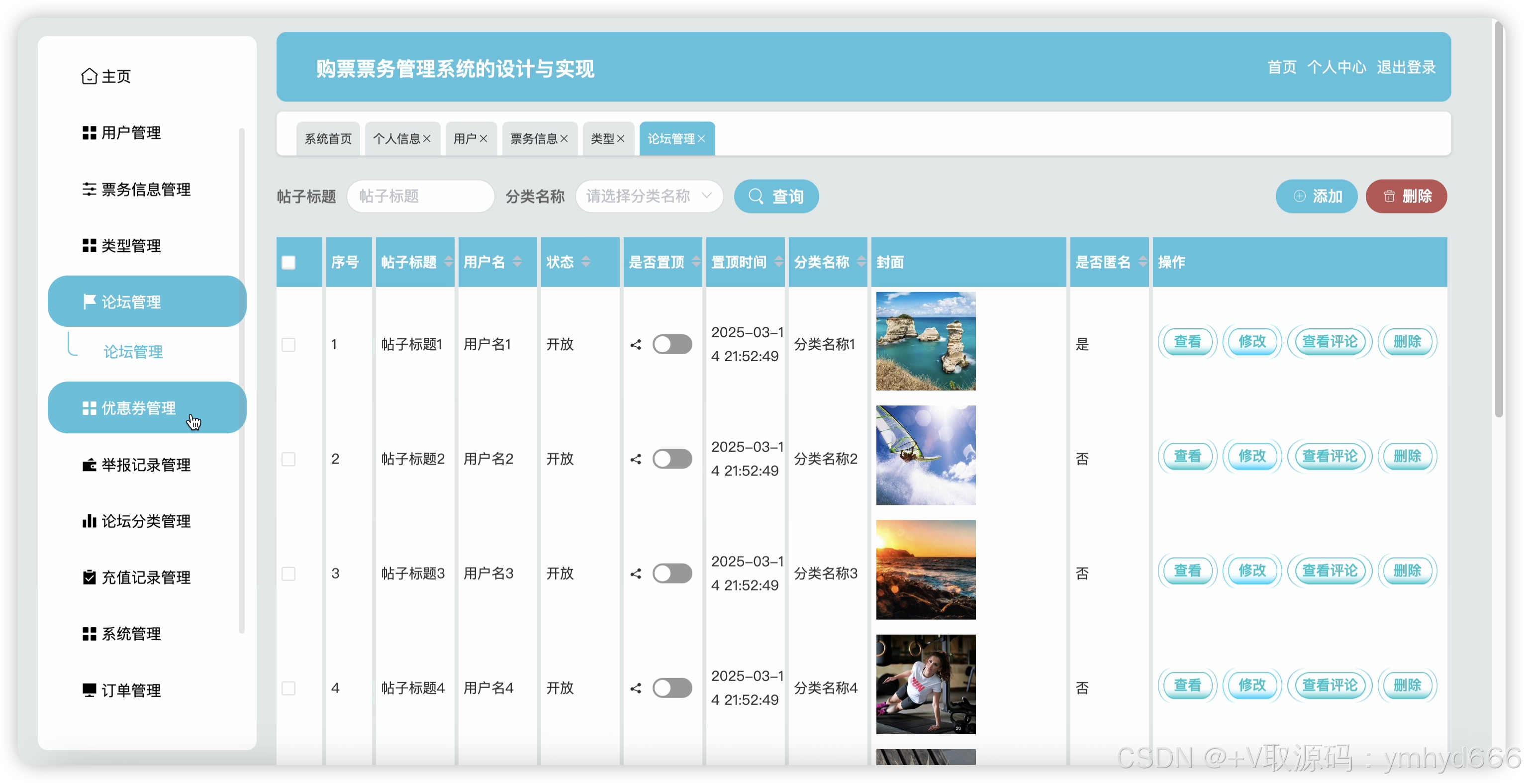 管理员功能:登录、用户管理、票务信息管理、订单管理、优惠券管理、论坛管理、公告管理、类型管理。