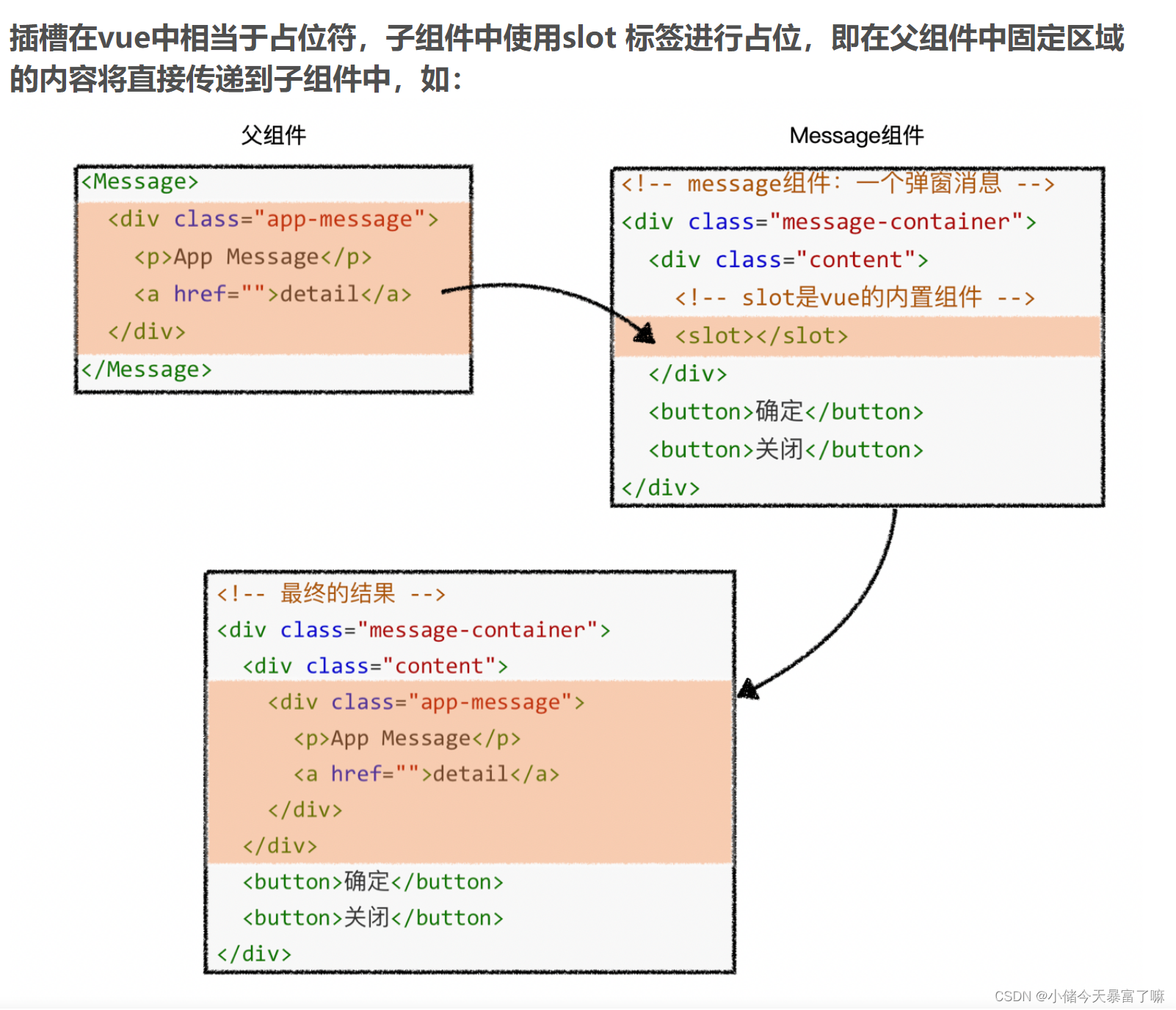 slot卡槽可以分为具名卡槽和默认卡槽,默认卡槽直接写在组件内部并插入到内容区域
