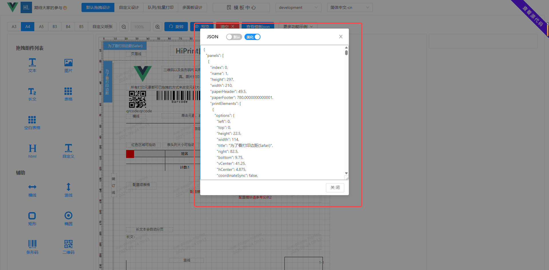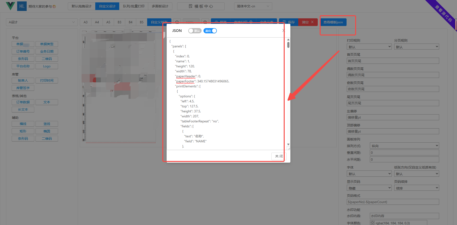红框里的就是你生成的模版,也是你要打印的样式,数据要自己写(数据要和json中的id对应)