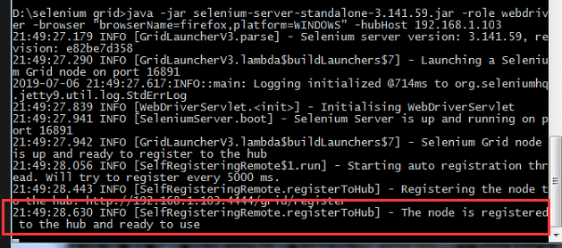 java -jar selenium-server-standalone-3.141.59.jar -role webdriver -browser "browserName=firefox,platform=WINDOWS" -hubHost 192.168.1.103(hub所在的主机地址)