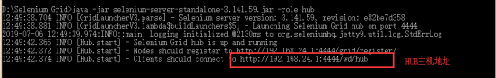 执行命令后,会初始化本机为hub服务器,自动分配一个ip地址(如图,这个地址是个虚拟地址,作为hub的主机地址,因为同一台机器可以同时作为hub和note,所以会自动生成一个虚拟地址),端口号默认为4444,当然你在初始化hub主机的时候也可以修改默认端口,添加-port=指定端口号即可