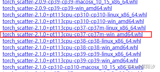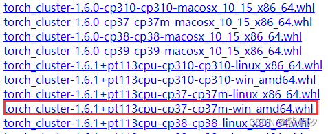 分别下载torch_cluster、torch_scatter、torch_sparse、torch_spline_conv对应版本的依赖包,保存于自定义的文件夹中(最好不要有中文)。其中,cp后为python版本号,cp37即为python3.7。