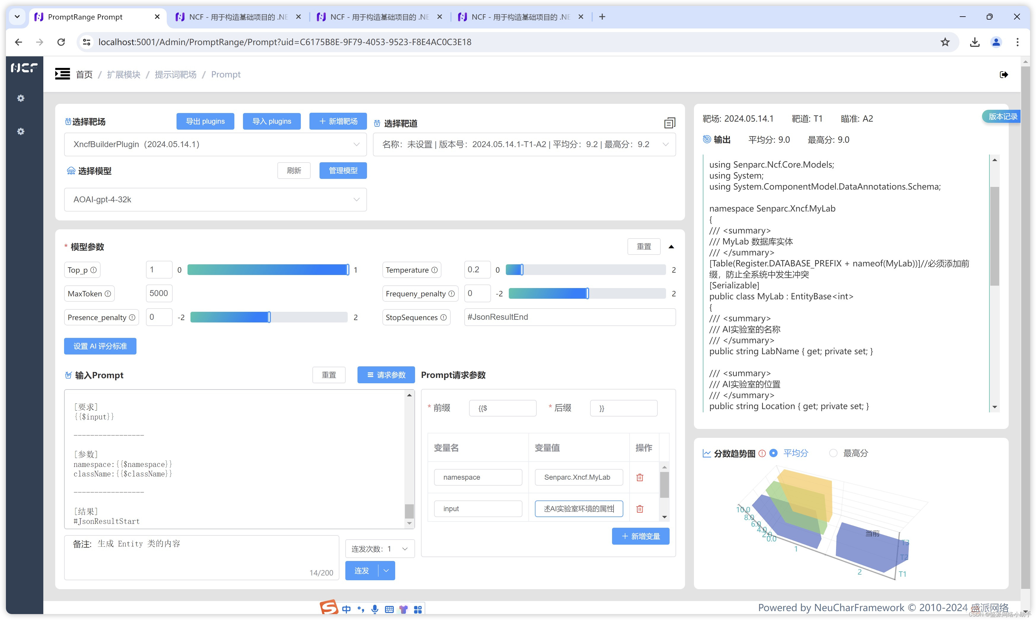 NCF 最新版本 v0.9.2 发布,PromptRange 全面接管文件类型 Prompt(如 Semantic Kernel 的 skprompt.txt 等文件 Plugin),XncfBuilder 模块 AI 自动生成代码目前已不需要任何 Prompt 文件,系统将为你自动初始化所有需要的提示词,并支持自行修改、版本化管理、AI 自动评分和自动选用。下一版本我们将提供多 Agent 的集成,同样享有 PromptRange 所有提示词管理特性。