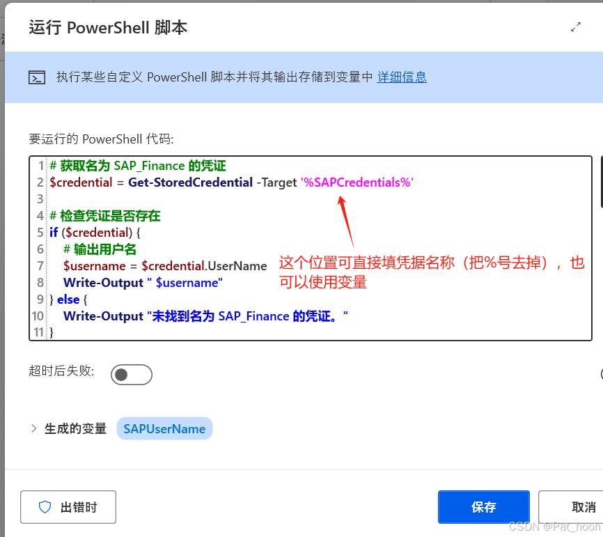 PS:如果使用凭据名是变量最好是从给变量赋值那一步开始,因为每次运行都会清空变量值。
