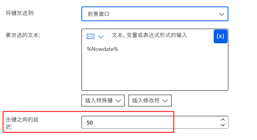 需要拆分这个步骤,通过点击跟输入来解决,关键在于调整击键之间的延迟,怀疑通过SAP自动化输入的速度太快了,导致出错,这里调整之后就不会出现输入错误的问题了。