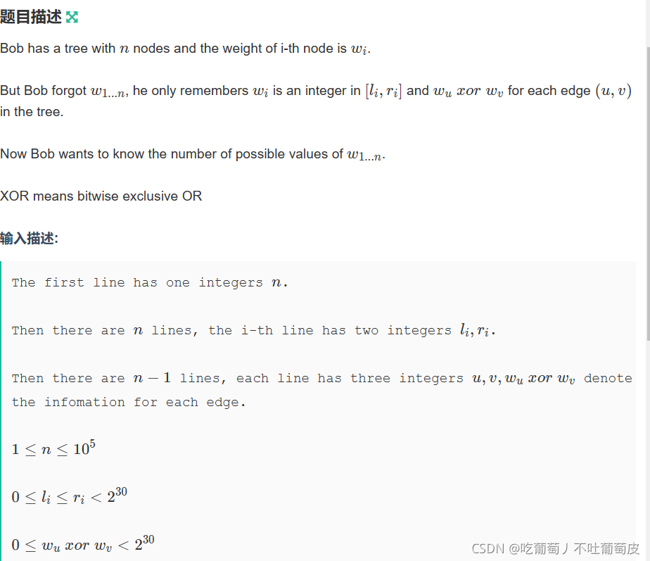 给你一颗树,n个节点,每个节点的权值为wi(未知),但是给你区间[li,ri],满足li<=wi<=ri,同时给你每条边的值表示Wu^Wv,求可能的情况数.
