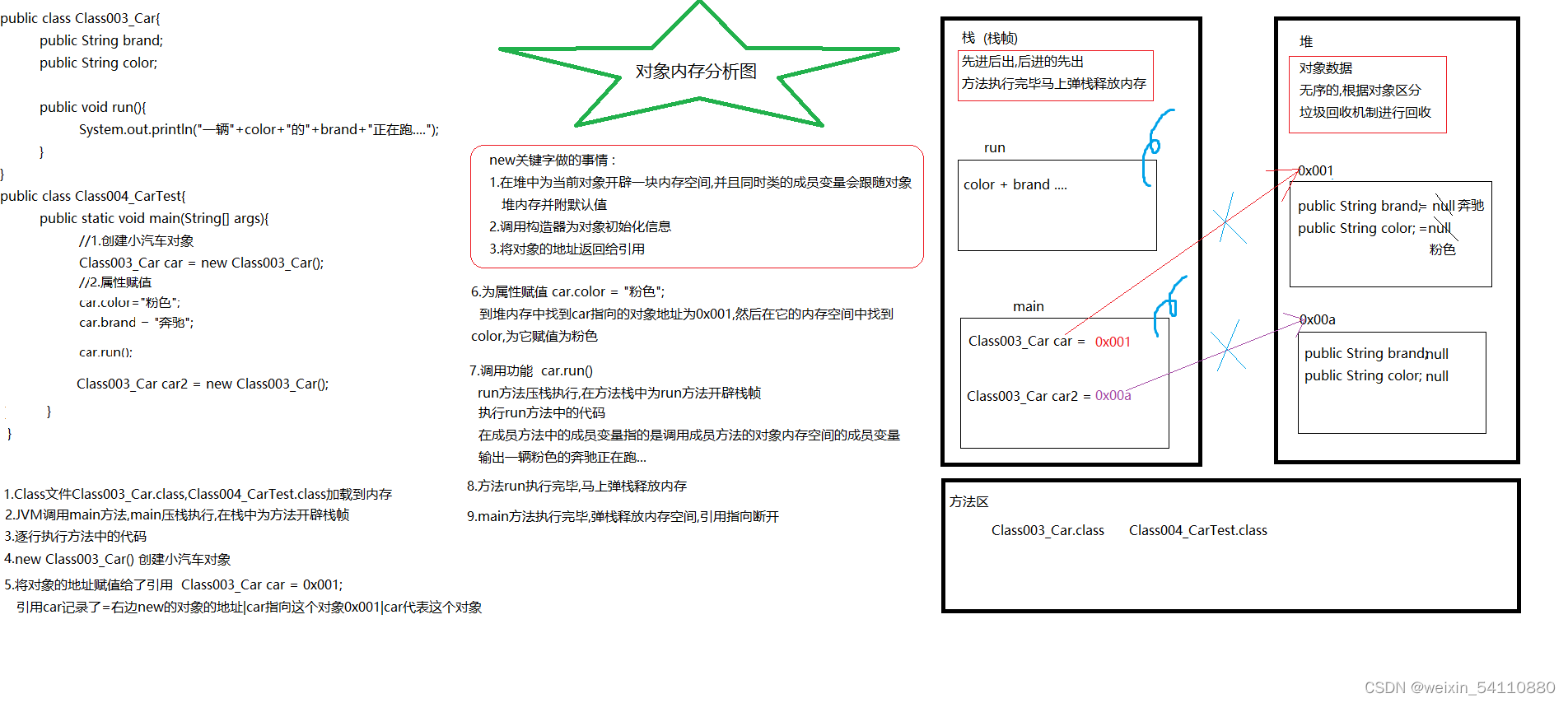 盖一栋楼,类相当于是一张图纸,类里面有桌子,椅子,床等东西,这些就是类里面的成员变量,new对象相当于把这栋楼盖起来了(我们只管这栋楼盖起来了,不管这栋楼是怎么盖的,我们只要结果,不要过程),将楼盖起来后就该给楼里面的桌子,椅子挑选样式(比如这个桌子什么颜色了,这个桌子叫什么名字了),等命名完后就可以进门入住使用了,main方法相当于是大门,只有进大门才能使用里面的东西。